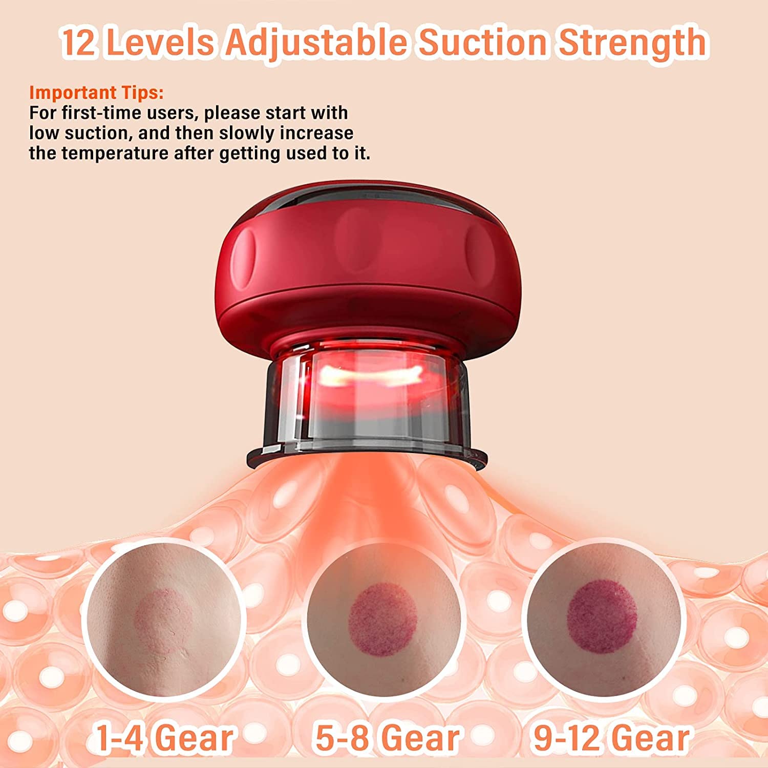 - 【Functional Mode】: Offering suction of 12 different modes and 12 intensity levels, Effectively promotes blood circulation, dredges the meridians, stimulates acupoints, relieves fatigue, relieves pain, and dispels cold and dehumidification.