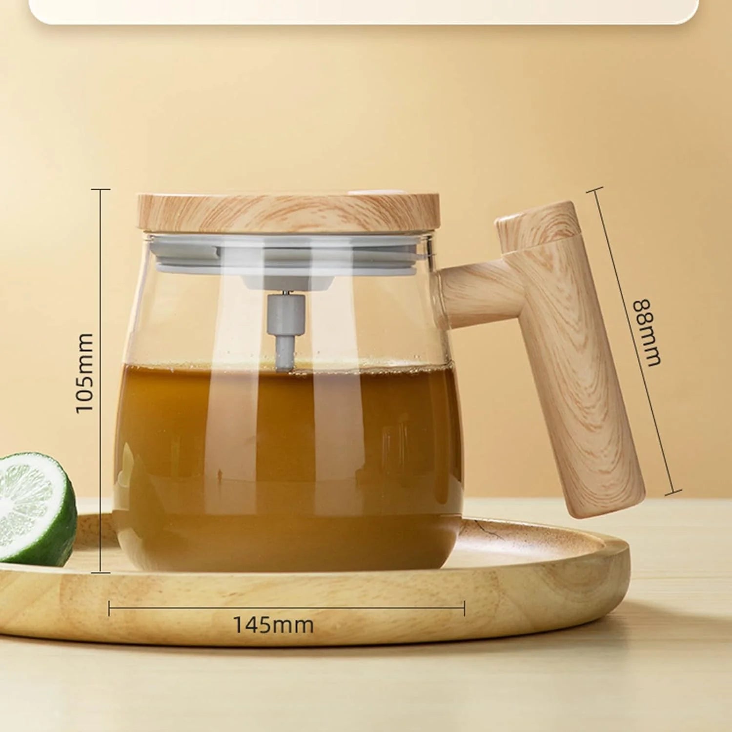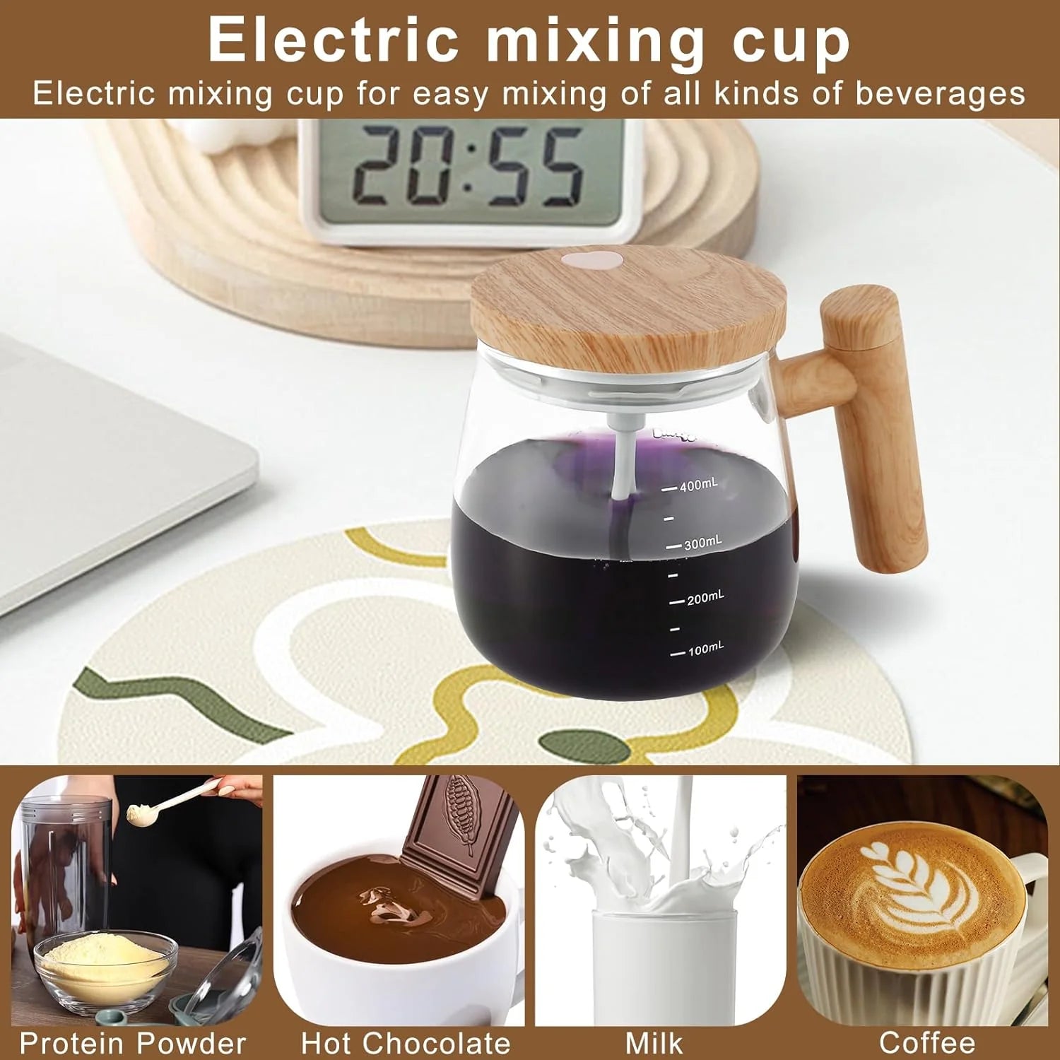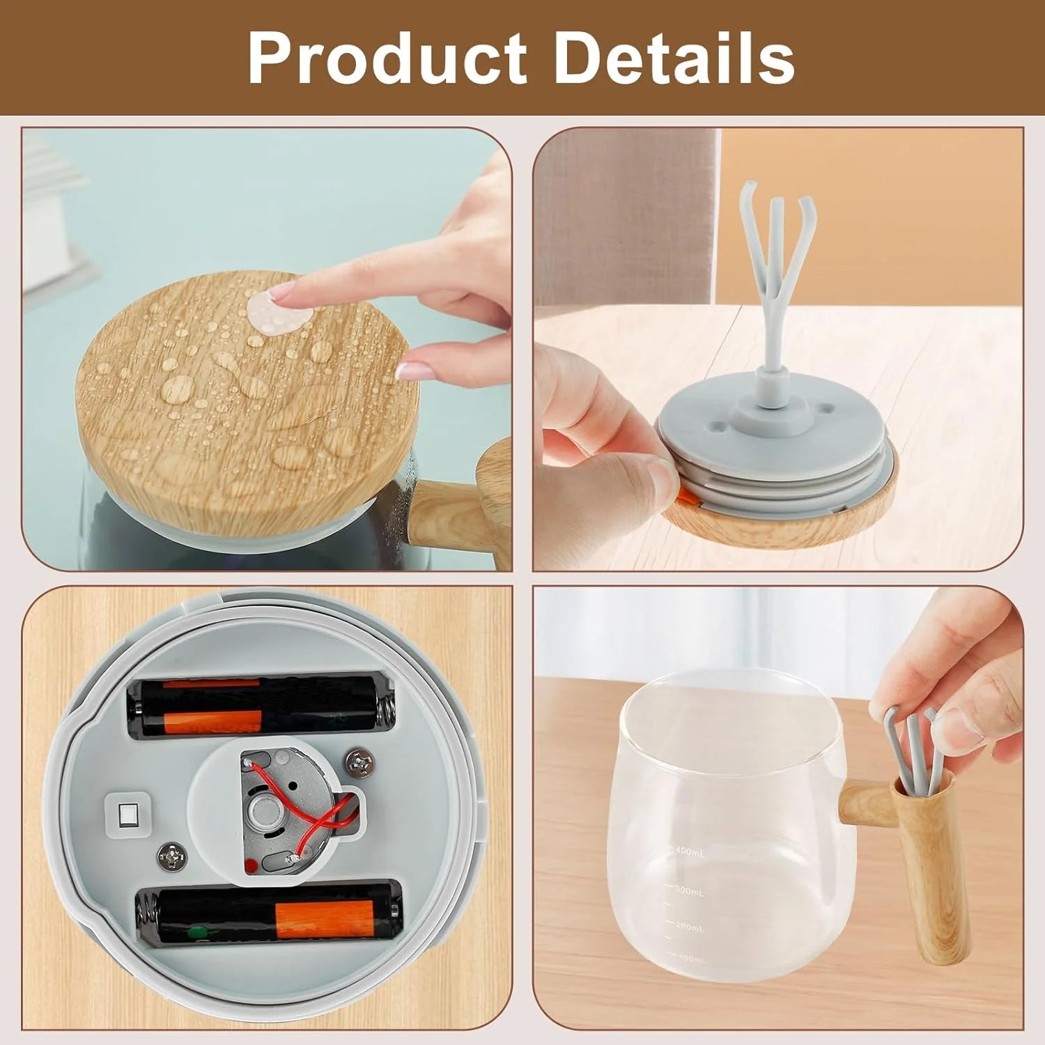 • 【Durable Glass Material】Electric Mixing Mug is made of sturdy borosilicate glass, which can easily cope with changes in cold and heat. An automatic stirring cup with a detachable stirring roda, a capacity of 400ml, equipped with a plastic wood-style handle and a spill-proof lid.